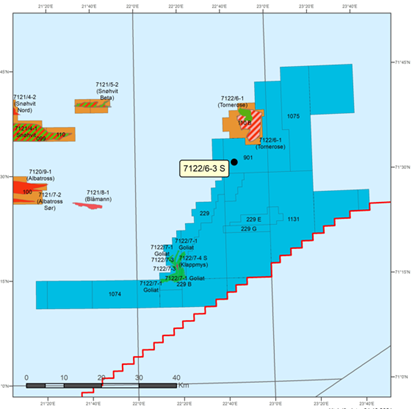 The exploration well is located approximately 30 kilometers north of the Goliat field and 5 kilometers south of the Tornerose discovery.